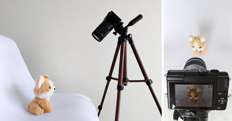 Схема съёмки: плюшевая игрушка, камера на штативе и изогнутый бумажный фон на стуле (слева); предпросмотр в реальном времени на экране камеры во время съёмки (справа).